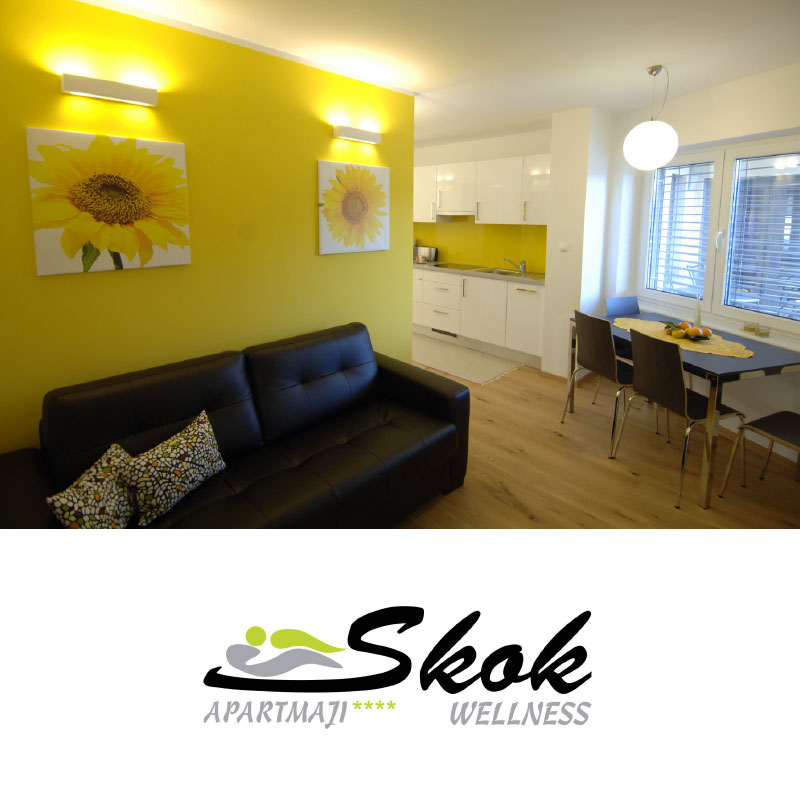 Storitev za 2 osebi zajema: • 2 x nočitev v apartmaju Marjetica, Sončnica, Vijolica ali Vrtnica; • 2 x zajtrk, • 1 x 3 urni najem koles (možnost doplačila za električna); • 15 % popusta na wellness storitve in izbor drugih storitev za nego telesa v Wellness centru Skok; • v poletni sezoni možnost koriščenja naravnega bazena; • končno čiščenje. Turistična taksa se plača pri ponudniku.